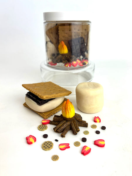 Includes: 4oz KidDough Graham Cracker/Marshmallow/Chocolate scented KidDough plus faux graham crackers, marshmallows, chocolates, roasting stick and a campfire.