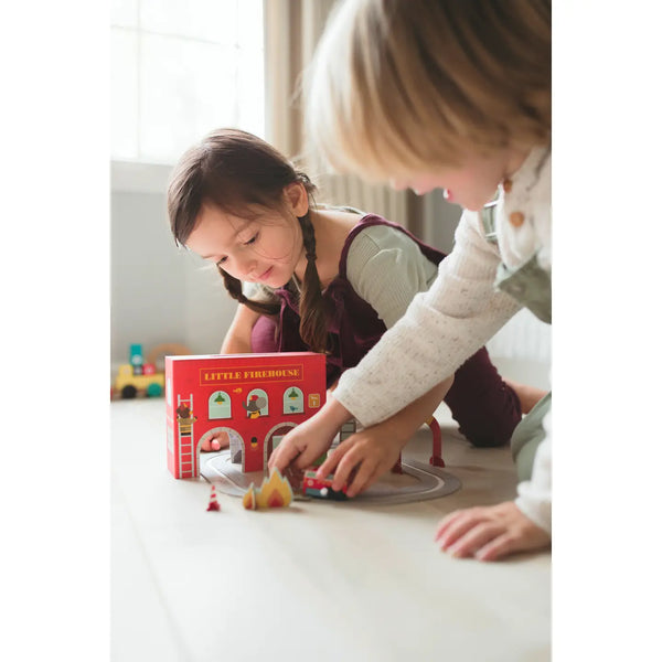 Help is on the way! Wind up the fire engine and watch it zip around the fire station with this little Wind-Up and Go Play Set from Petit Collage! Perfect for hours of imaginative play, the set is also easily portable with a cotton cord handle for on-the-go fun.